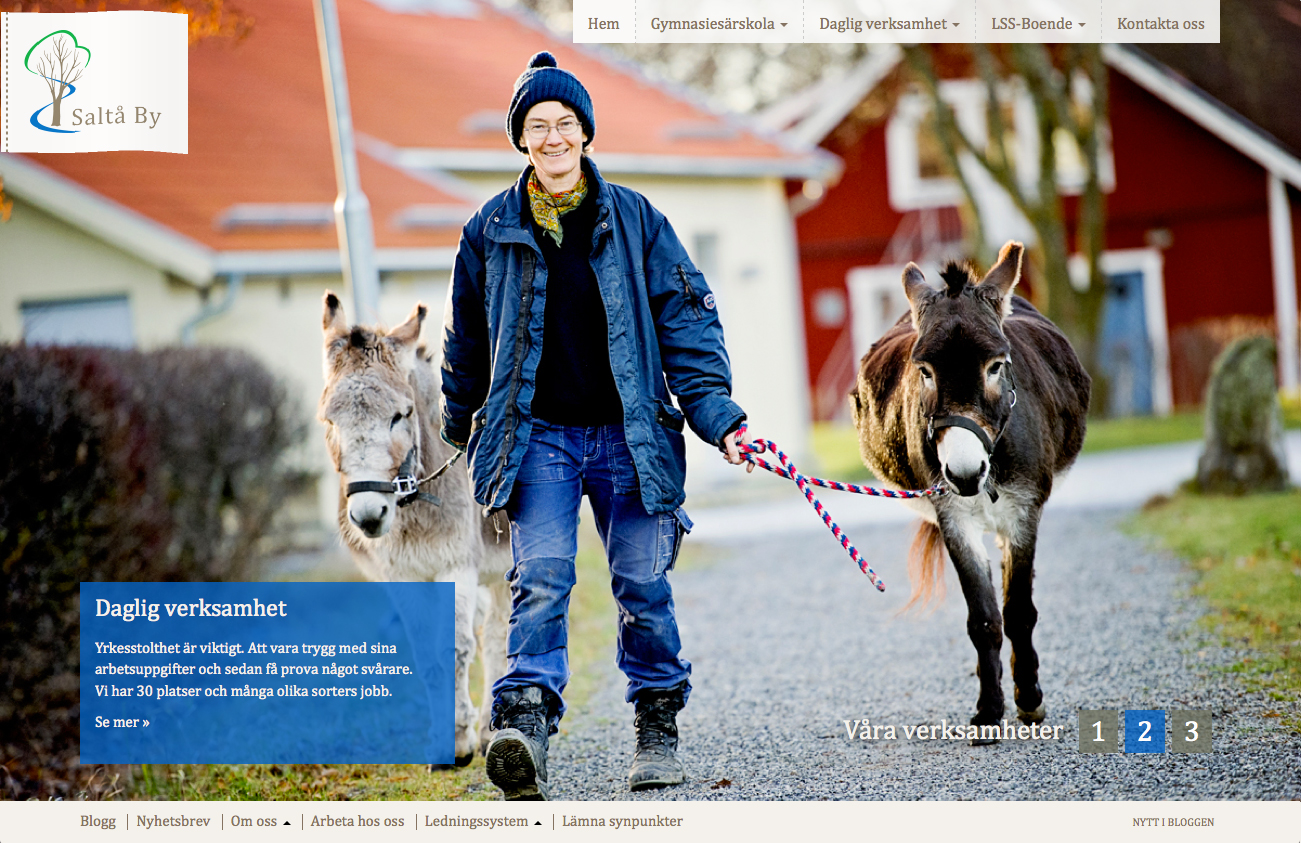 Vi har just blivit klara med ett nytt roligt jobb åt fina Saltå By. I mer än 70 år har Saltå by erbjudit människor med psykiska funktionsnedsättningar trygghet och utveckling. De erbjuder i dag bland annat en gymnasiesärskola i Järna, Södertälje, söder om Stockholm, LSS ungdomsboende i Järna och daglig verksamhet. På den nya hemsidan som vi just lanserat får bilderna stå i fokus. Vi arbetar just nu även med skyltning på området.